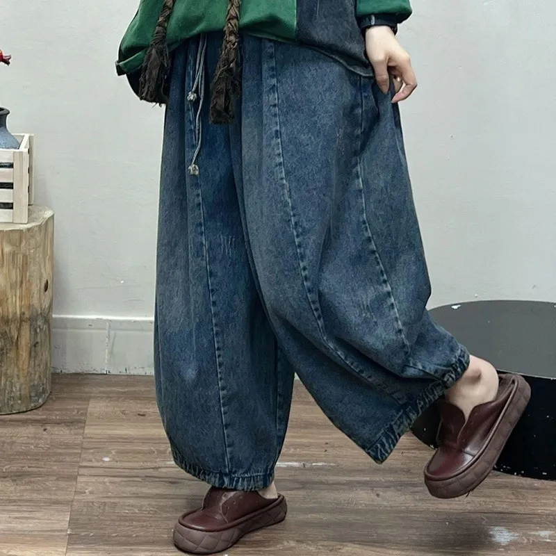 2023 New Spring Arts Style Women Elastic Waist Cotton Denim Wide Leg Pants Patchwork Design Vintage Blue Length Loose Jeans C825