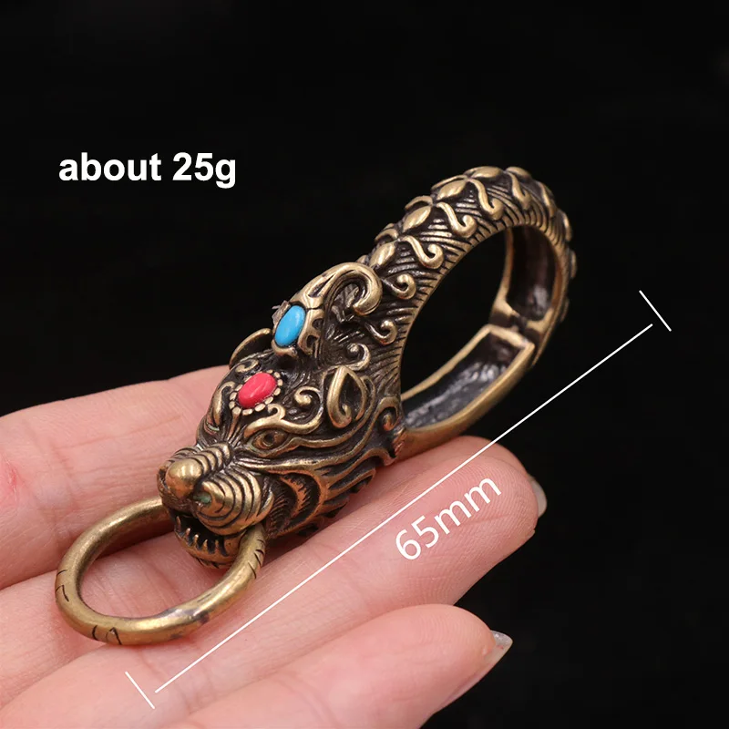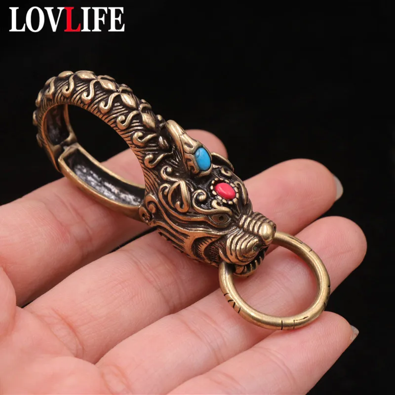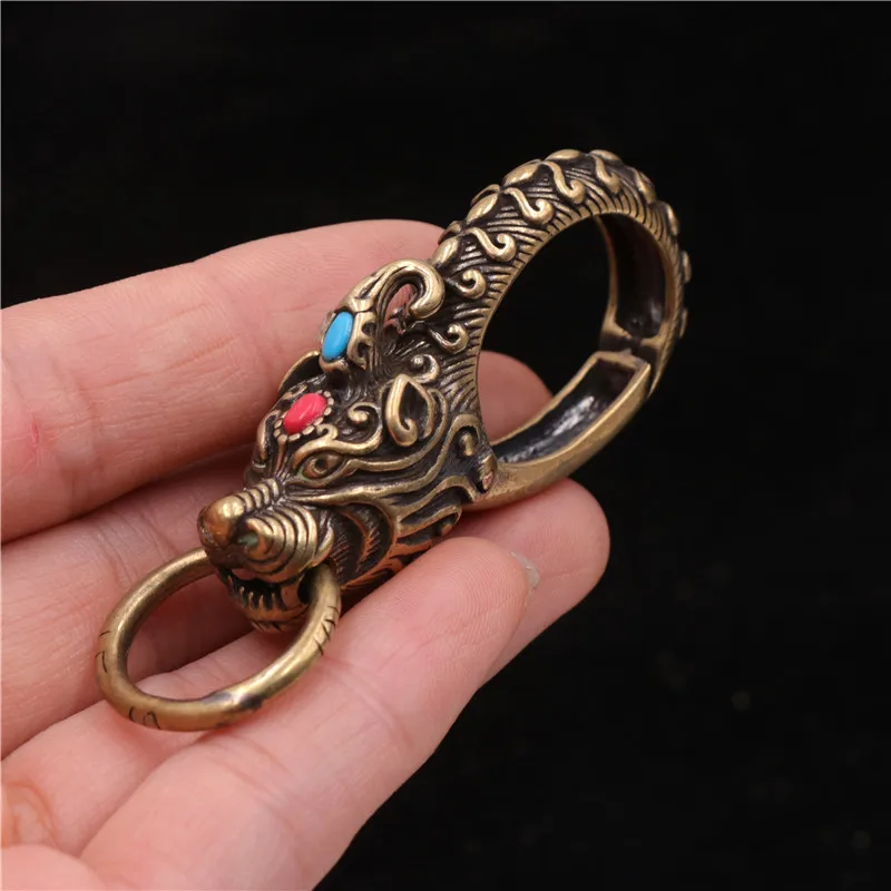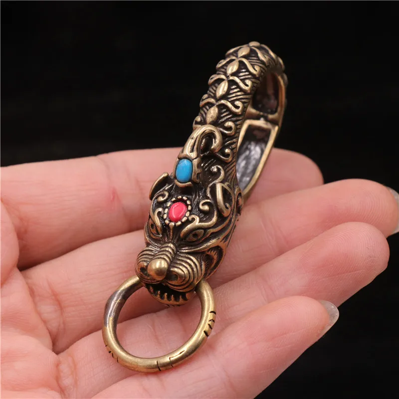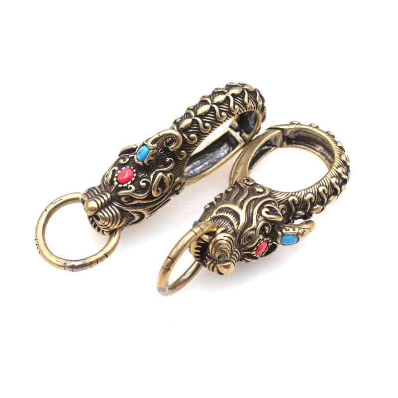 Brass Chinese Ancient Beast Qilin Head Car Keychain Hook Vintage Copper Waist Buckle Animal Pant Hanging Accessories