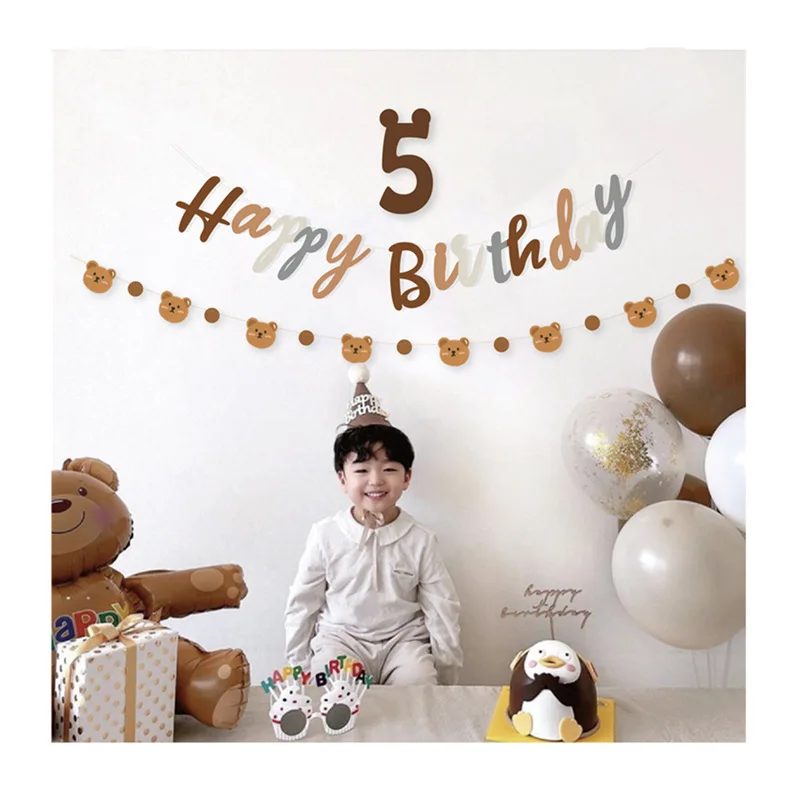 Brown Little Bear Themed Happy Birthday Banner Cute Bear Paper Bunting Garland Hanging for Bear Kids Baby Shower Birthday Decor