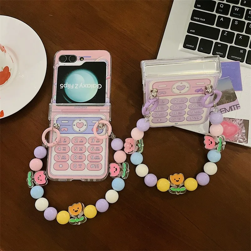 Cartoon Flower Wrist Chain Case for Samsung Galaxy Z Flip 6 5 4 3 flip6 ZFlip Beads Bracelet Love Heart Phone Ins Korean Cover