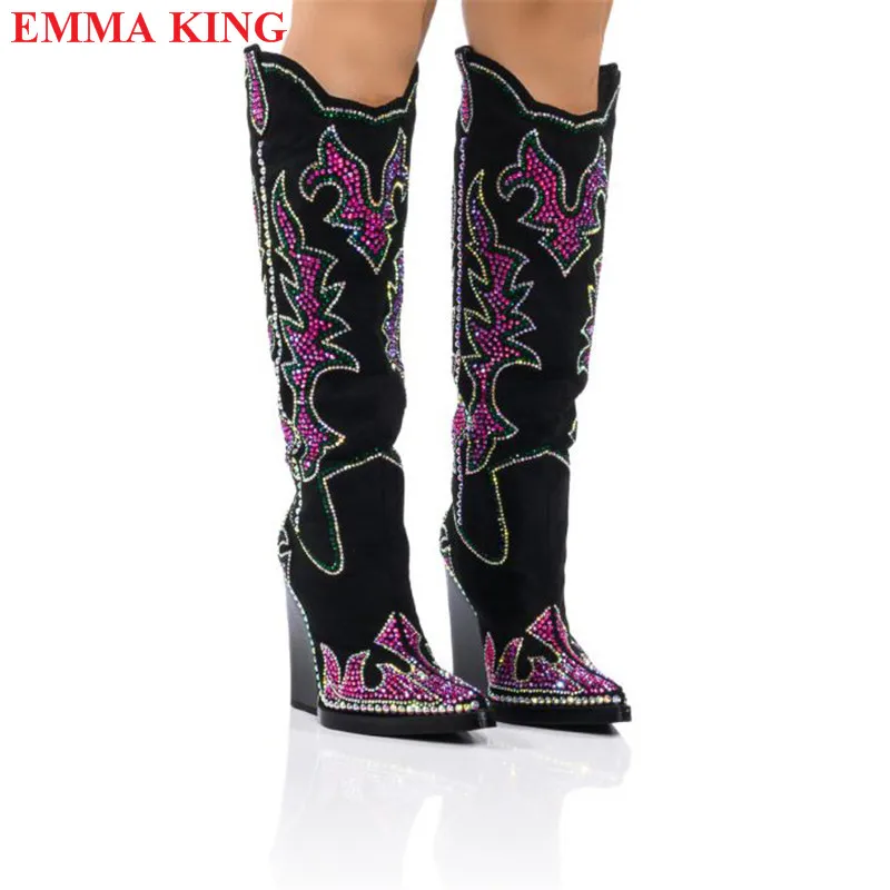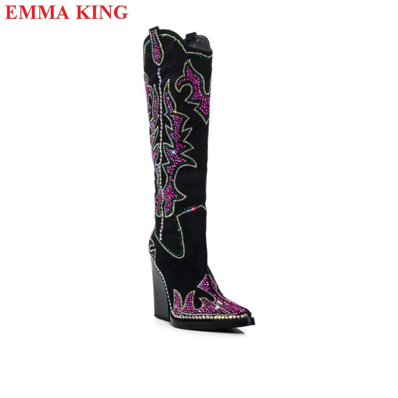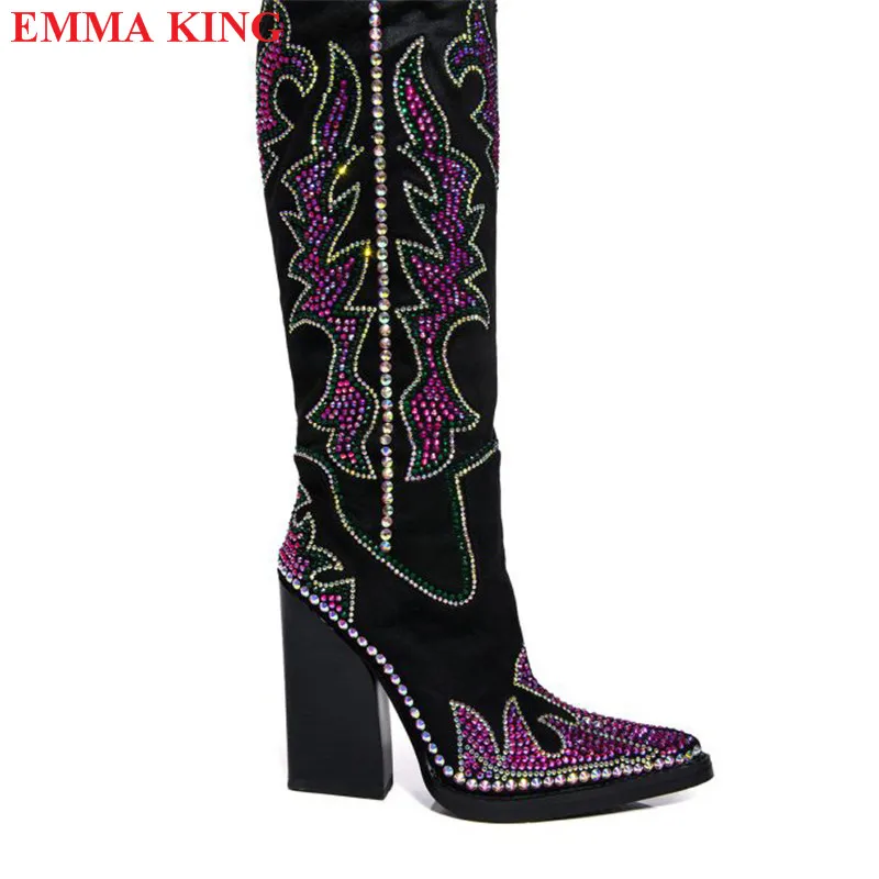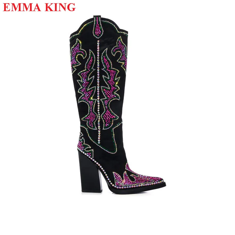 Cowboy Black Cowgirl Boots For Women 2022 Fashion Rhinestone Pointed Toe Chunky Heel Knee High Western Boots Casual Shoes Woman