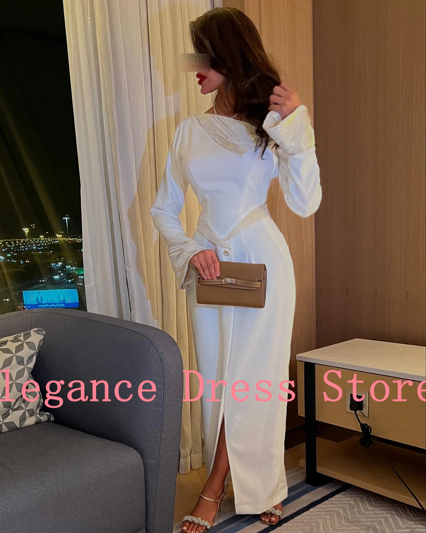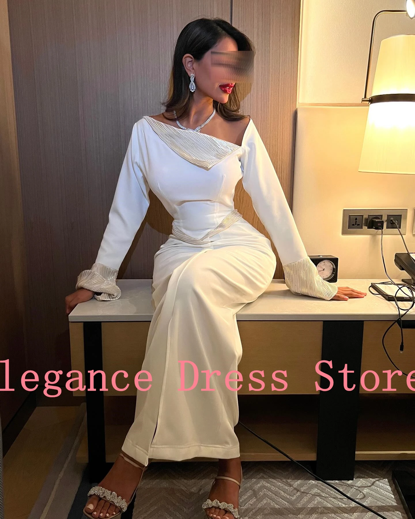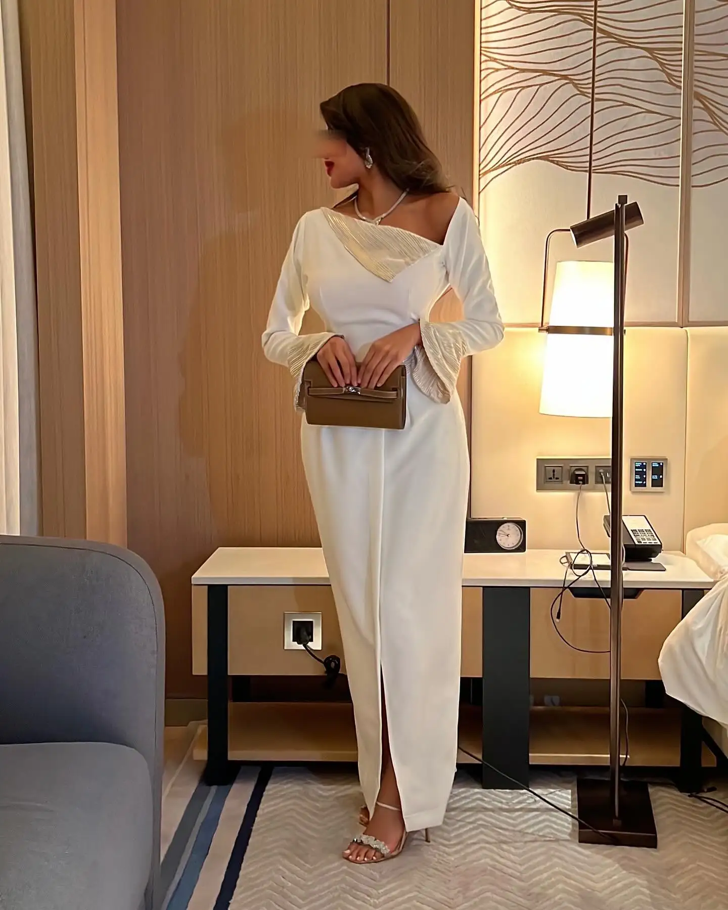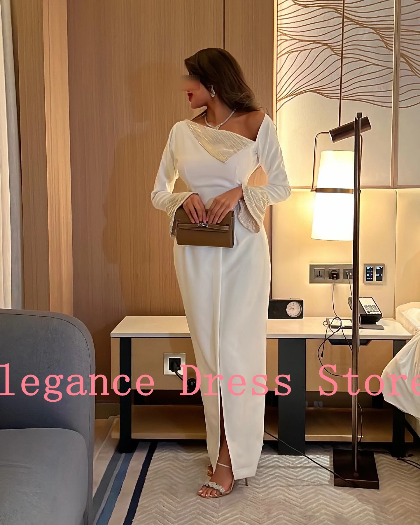 Customized Modern Off The Shoulder Long Sleeves Buttons Evening Dress Temperament Front Slit Pleats Photo Color Vestid