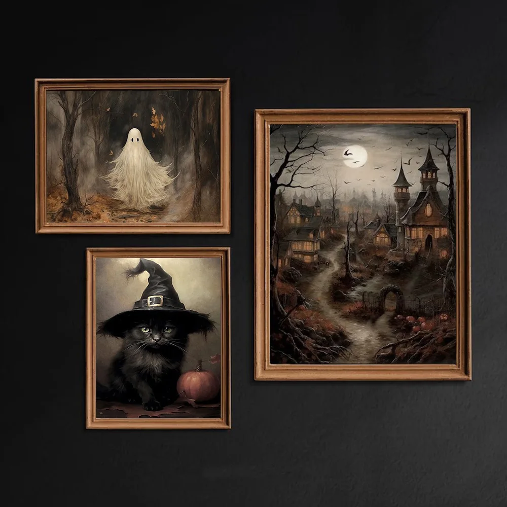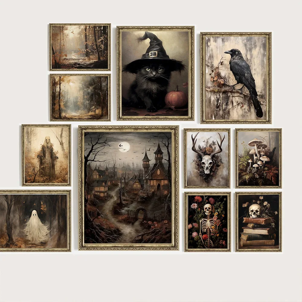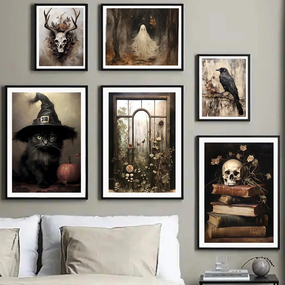 Dark Academia Art Witch's Black Cat Poster Prints For Gallery Home Decor Gothic Crow Haunted House Canvas Painting Wall Art