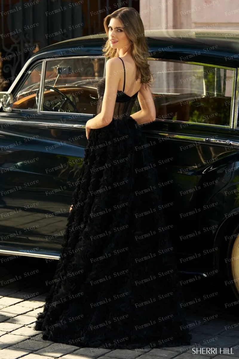 FORMALS Black Floral See Through Evening Dress Starps Folds Flowers Sleeveless Prom Dresses With Slit Floor Length Hollow out