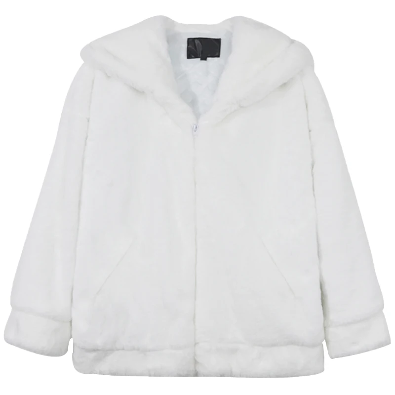 Mauroicardi Winter Oversized White Faux Fur Coat Men with Hood Long Sleeve Zipper Casual Loose Fluffy Jacket for Men Style 2021