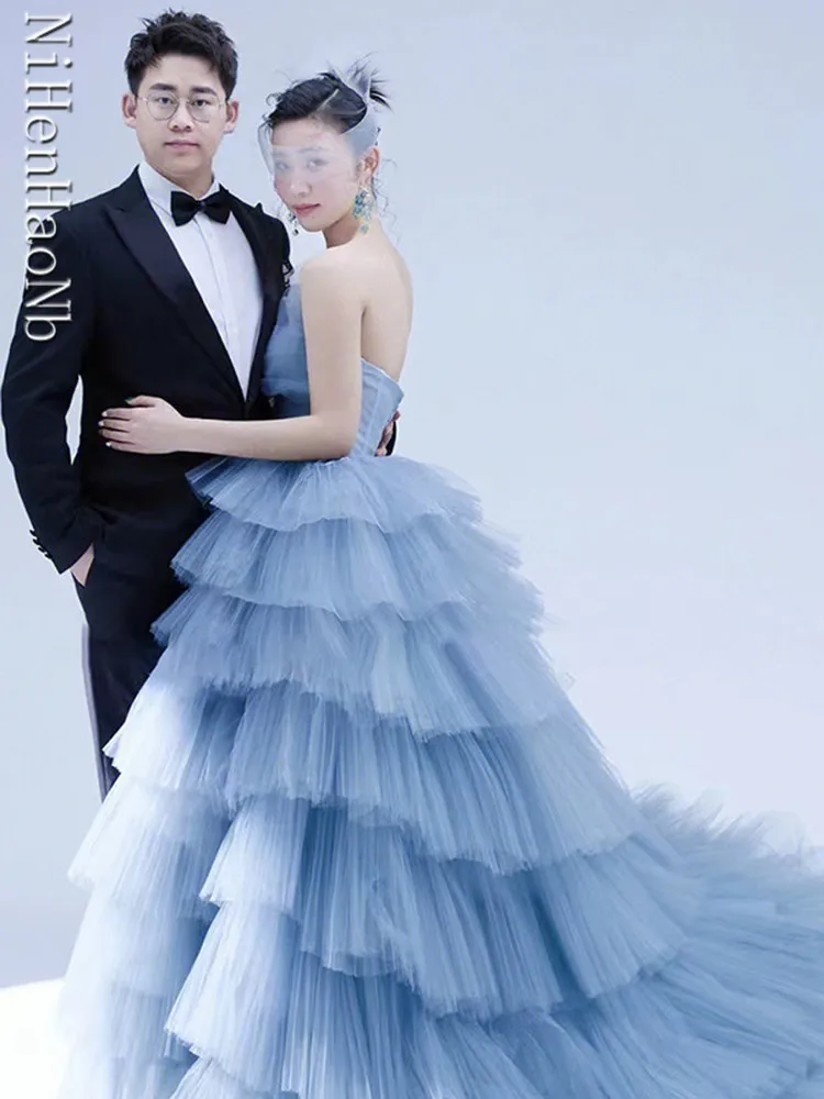 Princess Blue Quinceanera Dresses Strapless Multi-layer Evening Dress Sexy Sweep Tail Party Dress