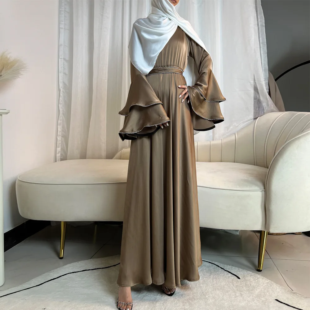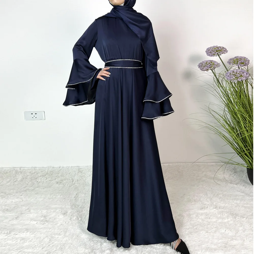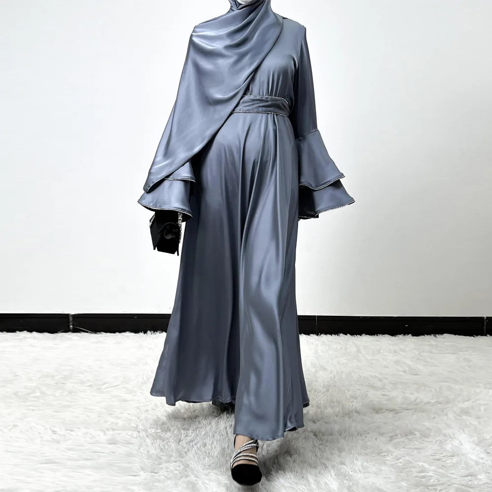 Ramadan Eid Satin Abaya Muslim Women Hijab Dress Belt Robe Diamonds Flare Sleeve Evening Party Gown Dubai Kaftan Turkey Jalabiya