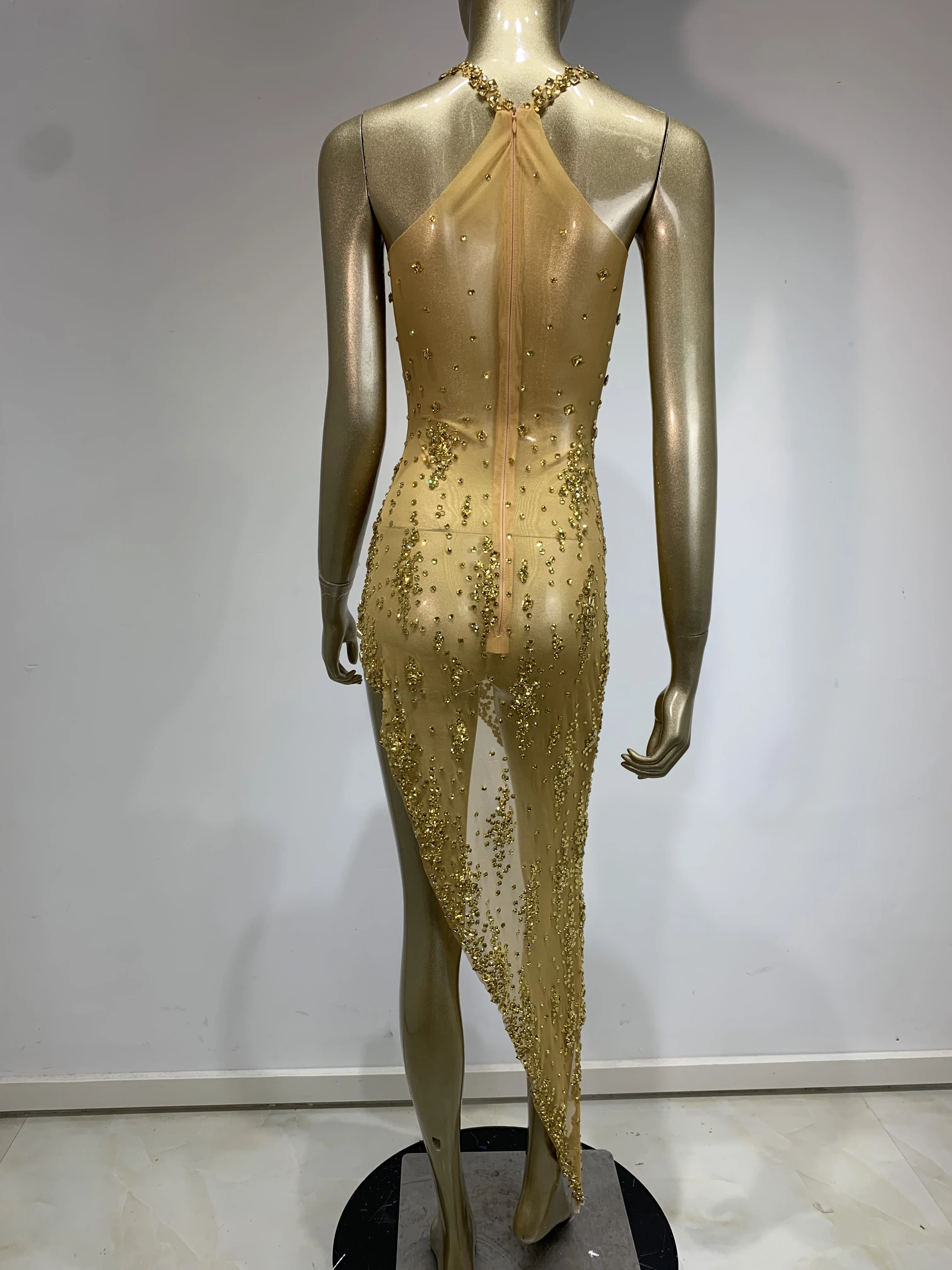 Stock Sparkly Gold Rhinestone Evening Dress Women Sexy Celebrity Birthday Party Sexy Mesh Photo Shoot Stage performance Costume