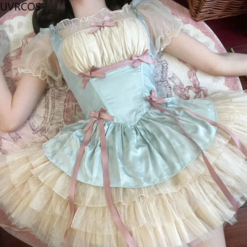 Victorian Sweet Lolita Dress Women Kawaii Bowknot Print Ruffles Party Mini Dresses Japanese Vintage Elegant Mesh Princess Dress