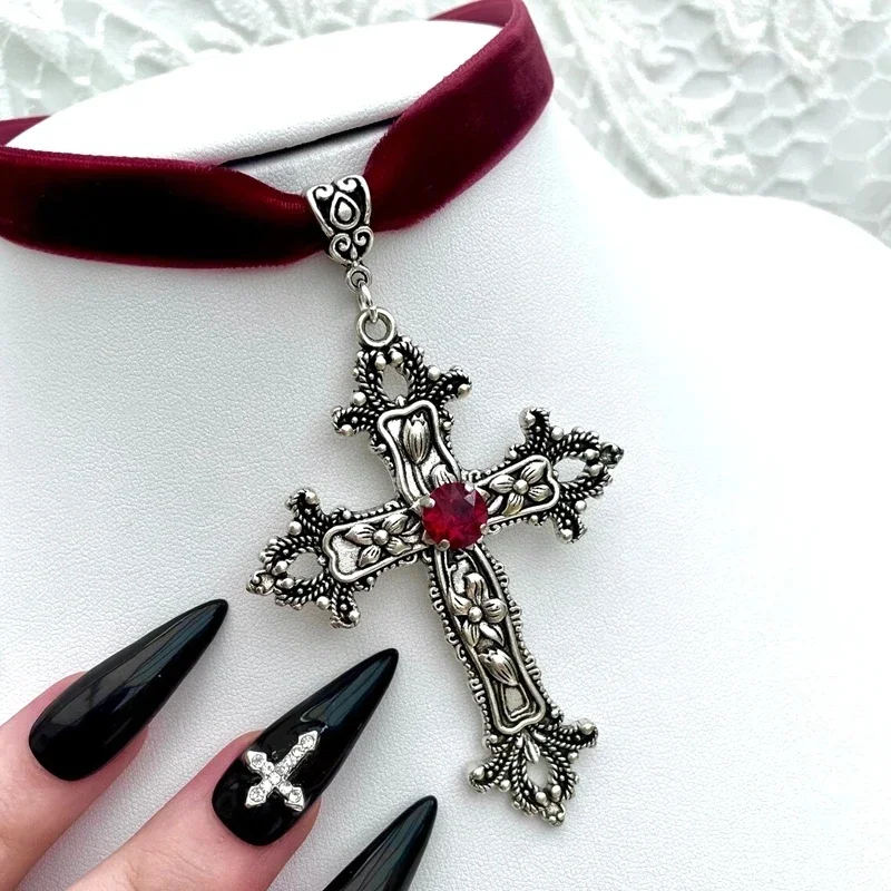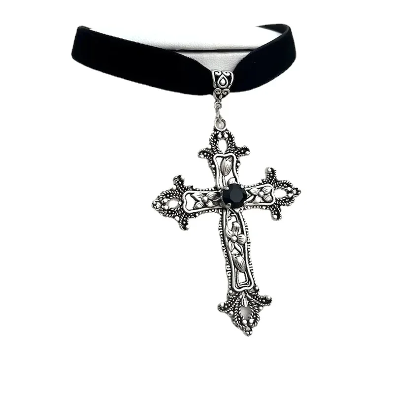 Vintage Gothic Large Cross Black Velvet Choker Ornate Cross Black Velvet Grunge Choker Gift for Her
