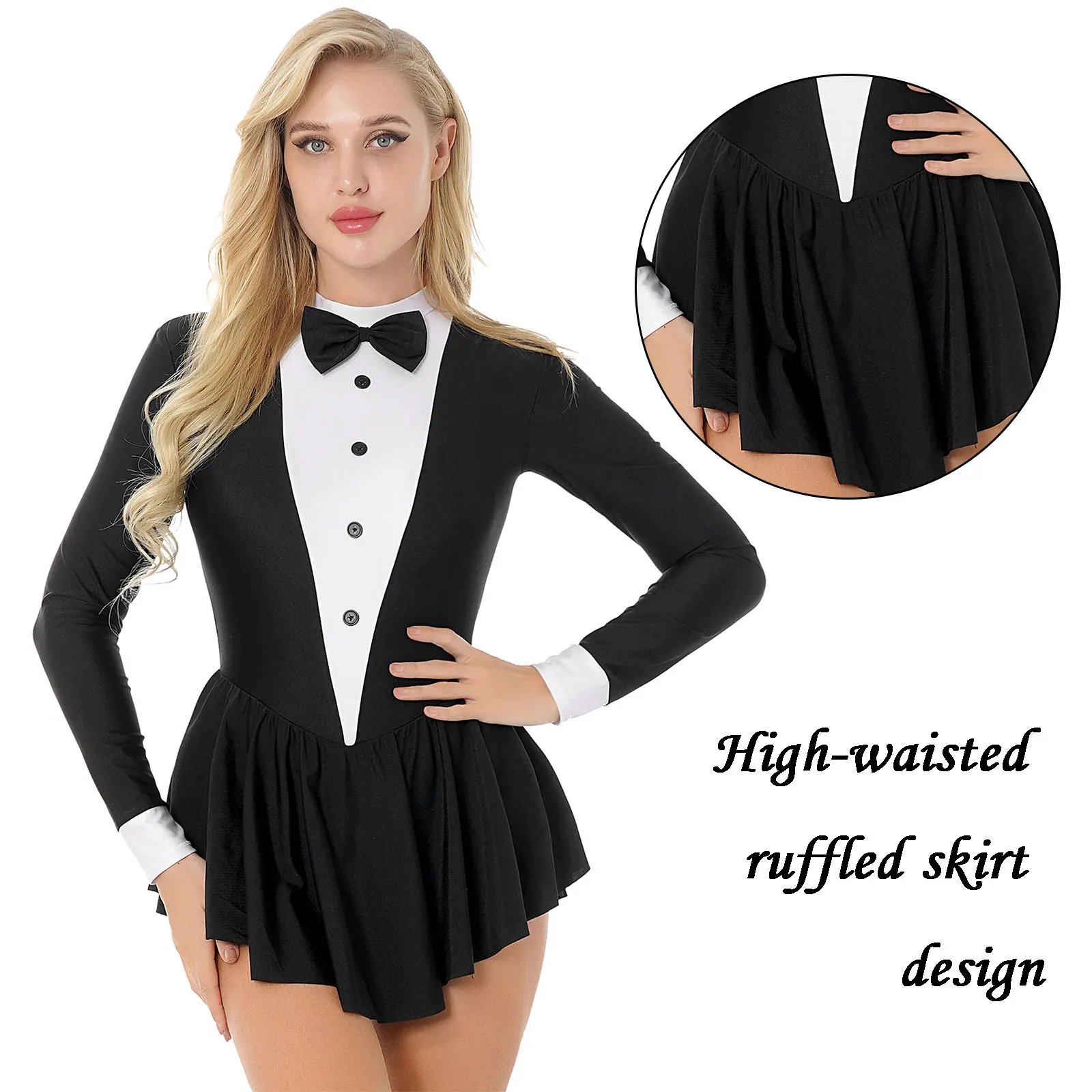 Women Long Sleeve Ballroom Latin Dance Dress Bowknot Ruffle Tuxedo Leotard Dresses Waitress Cosplay Costume Dancewear Clubwear